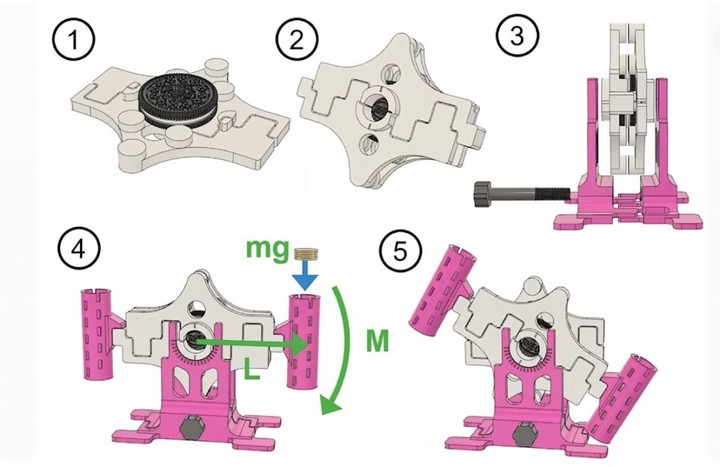 于是为了在实验室之外进行进一步的研究,研究人员开发了一种奥利奥分离装置——「Oreometer」,这是一个 3D 打印的扭转测试设备,专为奥利奥和类似尺寸的圆形物体设计,不需要电源或电子设备,材料成本为 6 美元 (包括硬币和橡皮筋) ,可以广泛使用。