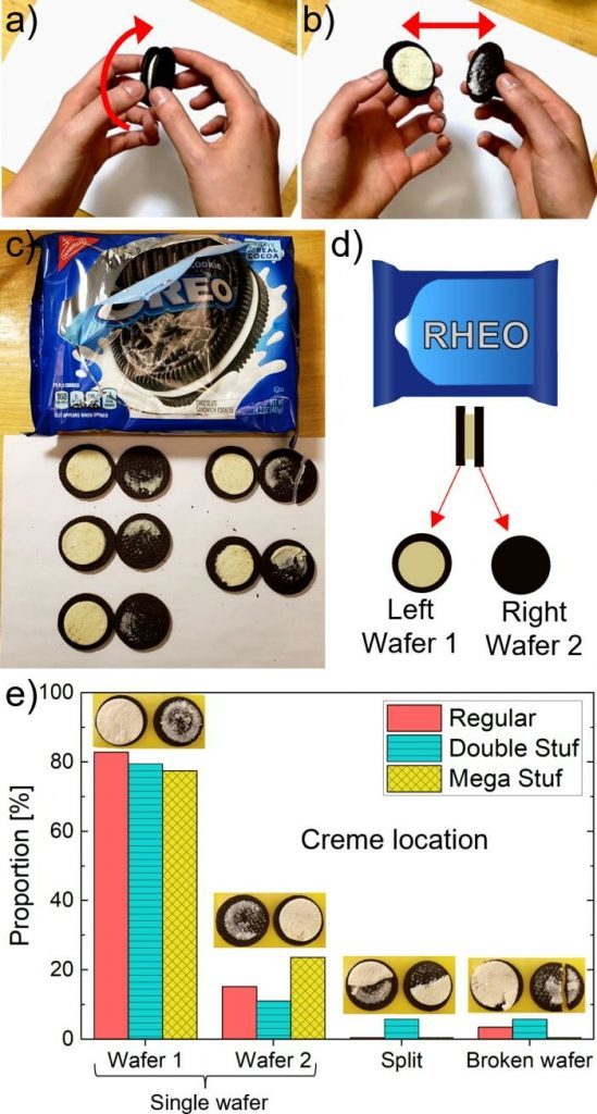为了找到答案,研究小组在实验室对饼干进行了标准的流变学测试,发现无论奥利奥中间这层奶油是什么口味和填充了多少,在扭开时几乎总是粘在一块饼干上。只有较旧的盒装饼干,奶油有时会更均匀地分布在两片饼干上。